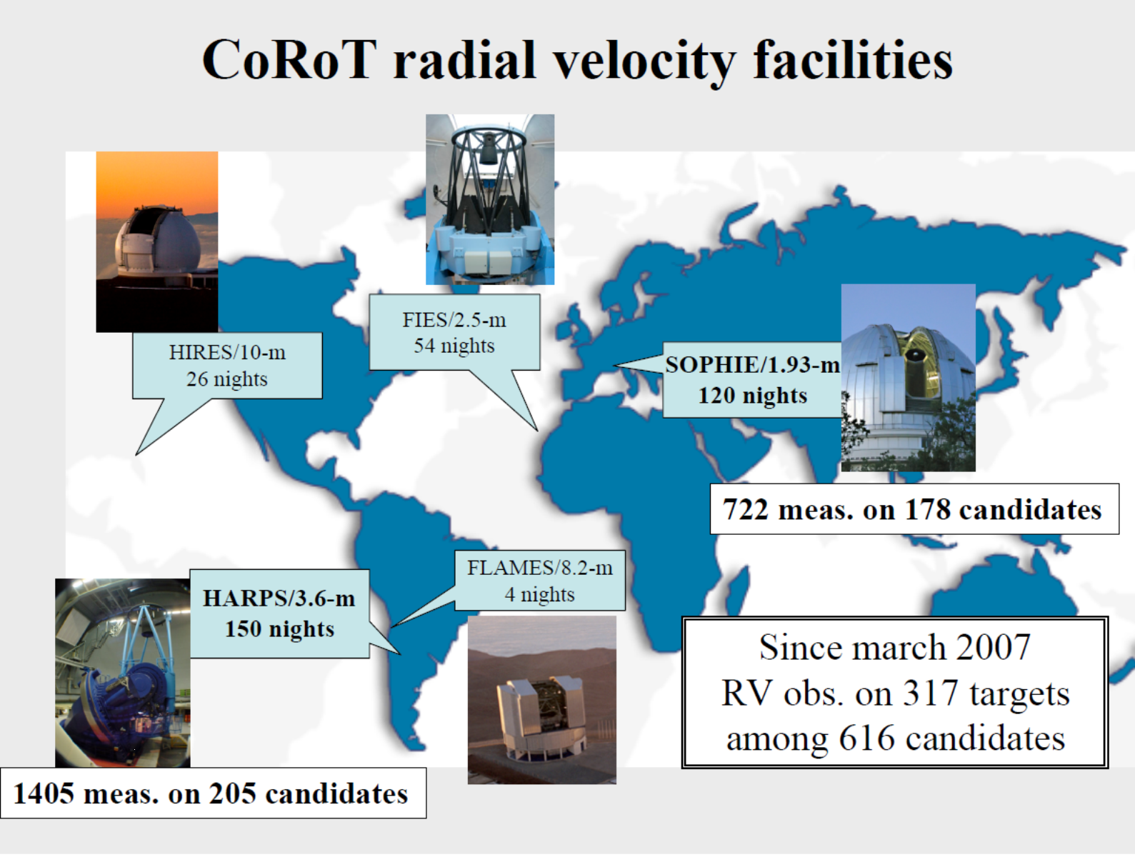 Mit CoRoT wurde in der gesamten Missionsdauer von 2006-2012 eine Vielzahl von sehr unterschiedlichen extrasolaren Planeten (von der Supererde bis zum aufgeblähten Gasriesen) (32 Planetensysteme bis „Datum“), sowie 2 braune Zwerge entdeckt. Unter ihnen ist auch der erste zweifelsfreie Gesteinsplanet CoRoT-7b. Das sind allerdings „nur“ die bestätigten Planeten, deren Massen und Natur zweifelsfrei bestimmt werden konnten. Einige weitere hundert Planeten-Kandidaten werden noch untersucht. Für die Nachbeobachtung der Planetenkandidaten standen viele Teleskope zur Verfügung (Abbildung 3):