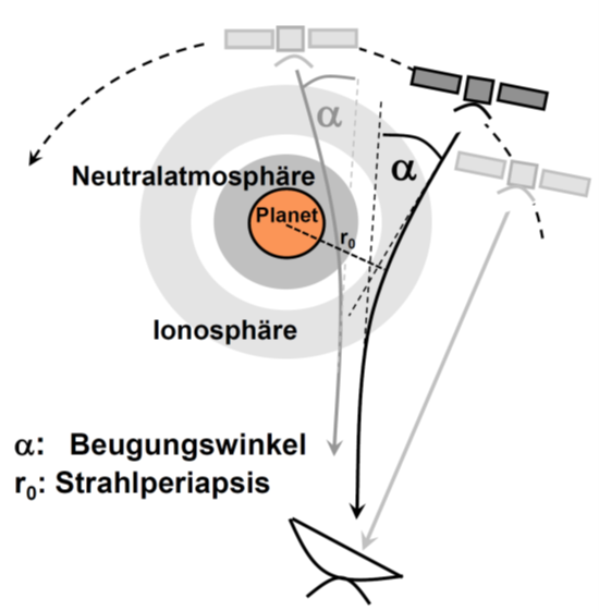 Untersuchungen der Neutralatmosphäre und Ionosphäre findet in sogenannter Erdokkultationsgeometrie statt. Während dieser Experimente verschwindet die Raumsonde von der Erde aus gesehen hinter dem zu untersuchenden Planeten, so dass sich die Radiosignale durch die Ionosphäre und Atmosphäre des Planeten ausbreiten (s. Fig. 2). Das Gleiche passiert beim Wiederauftauchen der Raumsonde auf der anderen Seite des Planeten. Dies führt zu einer Beugung des Trägersignals, die als Frequenzverschiebung in der Bodenstation sichtbar wird. Anhand von gemoetrischer Optik oder anderen mehr komplexen Verfahren kann aus dieser Frequenzverschiebung die Beugung des Signals berechnet werden und hieraus auf den Brechungsindex der Atmosphäre oder Ionosphäre als Funktion der Höhe geschlossen werden. In der Neutralatmosphäre lassen sich daraus in einem nächsten Schritt die Dichte, Temperatur und Neutralteilchendichte der Atmosphäre berechnen, während man in der Ionosphäre ein Elektronendichteprofil erhält. Radiookkultationen liefern sehr hochaufgelöste Profile (Auflösung wenige hundert Meter).