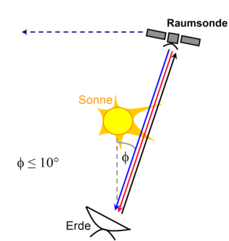Wann immer der Winkel zwischen Raumsonde, Sonne und Erde klein ist und die Raumsonde von der Erde aus weiter entfernt ist als die Sonne, breitet sich der Radiostrahl von der Raumsonde durch den Sonnenwind aus (s. Fig. 4). Dies kann genutzt werden, um Messungen der Sonnenkorona durchzuführen. Man benötigt hierfür zwei kohärente Frequenzen, um die plasmainduzierten Effekte von anderen Störungen zu separieren.