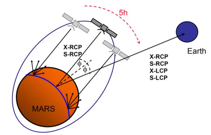 Figure 3: Messgeometrie für bistatische Radarmessungen. Die Hochgewinnantenne der Raumsonde ist auf die Oberfläche gerichtet und die von der Oberfläche reflektierten Signale werden auf der Erde aufgezeichnet. Dies geschieht in zwei Polarisationen (rechts und links zirkular polarisiert) und zwei Frequenzen (X- und S-band).